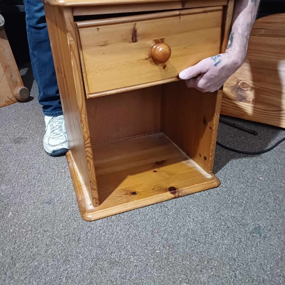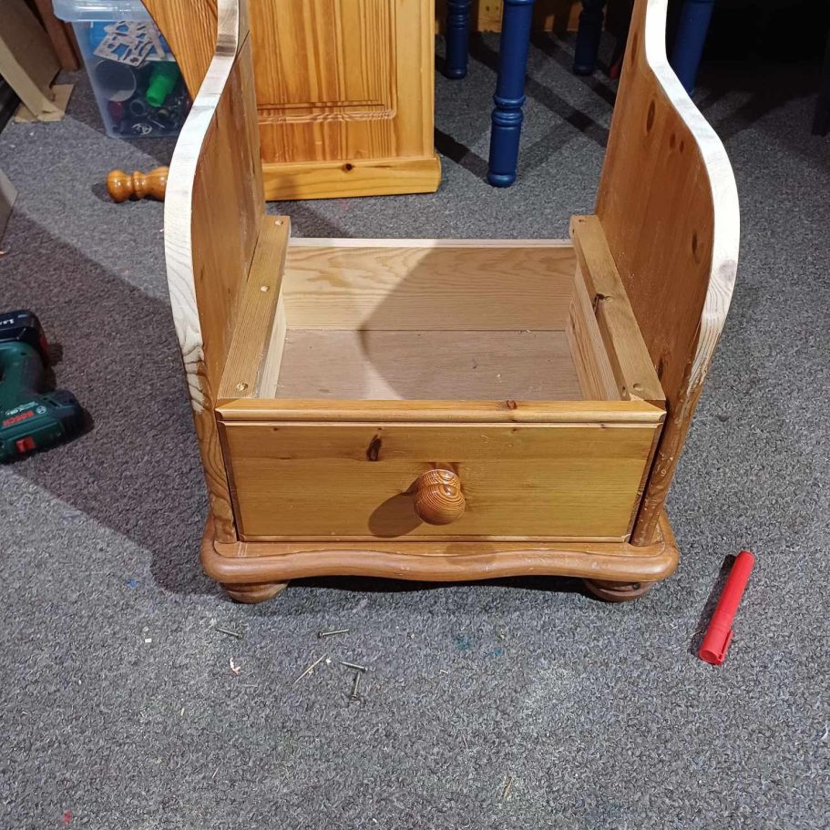 The start was the remains of pine bedside cabinet, the ideal shape for flipping this into the Storytime Chair. Moving some of the wood around helped to shape the chair.