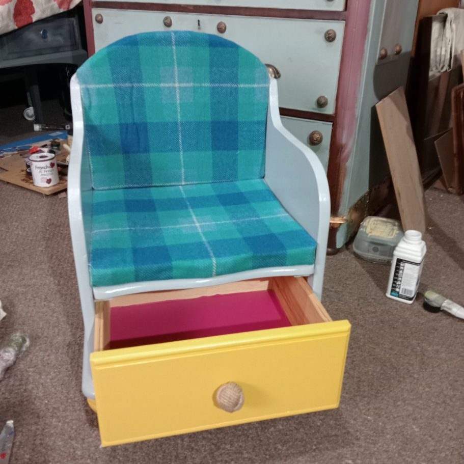 And ta-dah!! A Storytime Chair for our middle granddaughter Rosie! Have a nosey at the video below - she takes everything in her stride! The Harris Tweed for the seat was purchased when Rosie was first born and I made a change bag for her, it was lovely to carry on the theme.